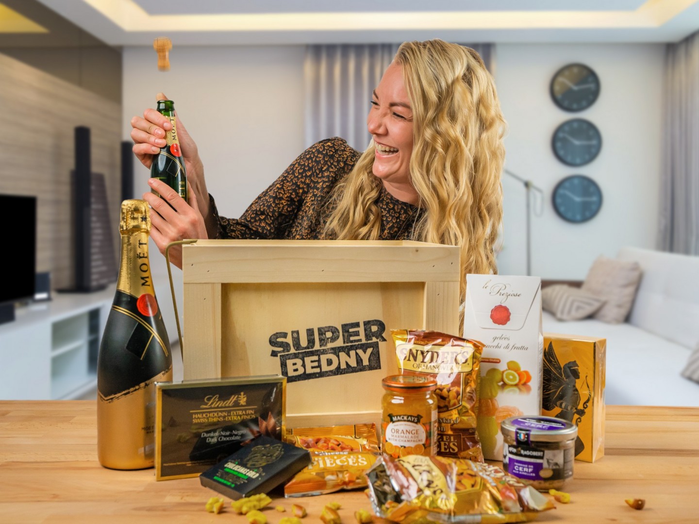 Luxusní bedna s lahví Brut Imperial se hodí ke každé slavnostní příležitosti. Šampaňské Moët & Chandon patří do skupiny LVMH (Louis Vuitton Moët Hennessy) - největšího světového podniku s luxusním zbožím. V bedně je navíc spousta delikates, jako jelení terina s brusinkami, arabské datle s mandlí nebo osvěžující pomerančová marmeláda se šampaňským.